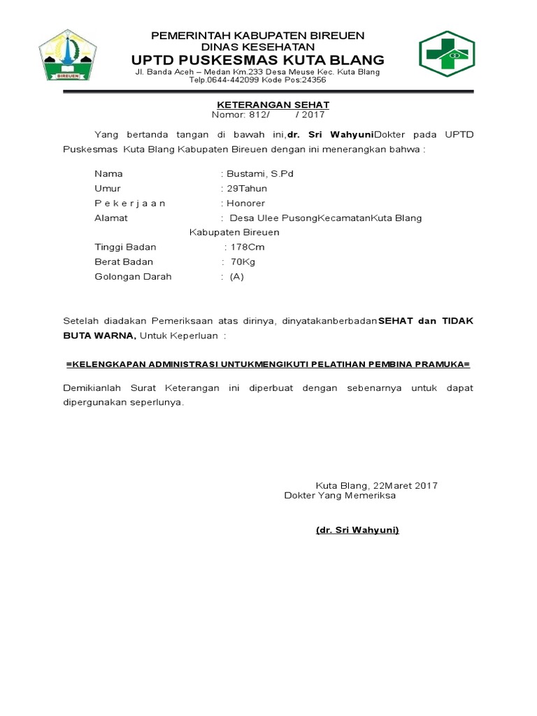 Contoh Surat Keterangan Berbadan Sehat Dari Puskesmas ... from imgv2-1-f.scribdassets.com Untuk mendapatkan surat keterangan sehat ini jika kamu membuatnya di pusat kesehatan masyarakat (puskesmas) biayanya adalah gratis. Buat kamu yang sedang memerlukan surat keterangan sakit untuk cuti kerja, kuliah ataupun surat keterangan sehat dari dokter, kamu dapat meminta pihak klinik dan. Surat kematian sangatlah penting digunakan untuk. Dari segi bidang maupun fungsi pada proses pembuatan contoh surat ini perlu dihadiri pejabat pemerintahan yang ditunjuk sebagai saksi serta tanda tangan sebagai acuan kredibilitas. Tujuan & manfaat dari surat pernyataan adalah sebagai penjamin kepastian hokum. Jika anda sedang dalam kondisi atau keadaan sakit dan tidak bisa beraktivitas seperti biasanya, maka mungkin saja anda akan pergi memeriksakaan dan berobat ke klinik, puskesmas. Biasanya surat ini dilengkapi dengan materai sebagai penguat kepercayaan dan agar terlihat kredibel. 44 9 a baak xii 201 2 tanggal 13 desember 201 2 tentang permohonan penelitian karya tulis ilmiah.